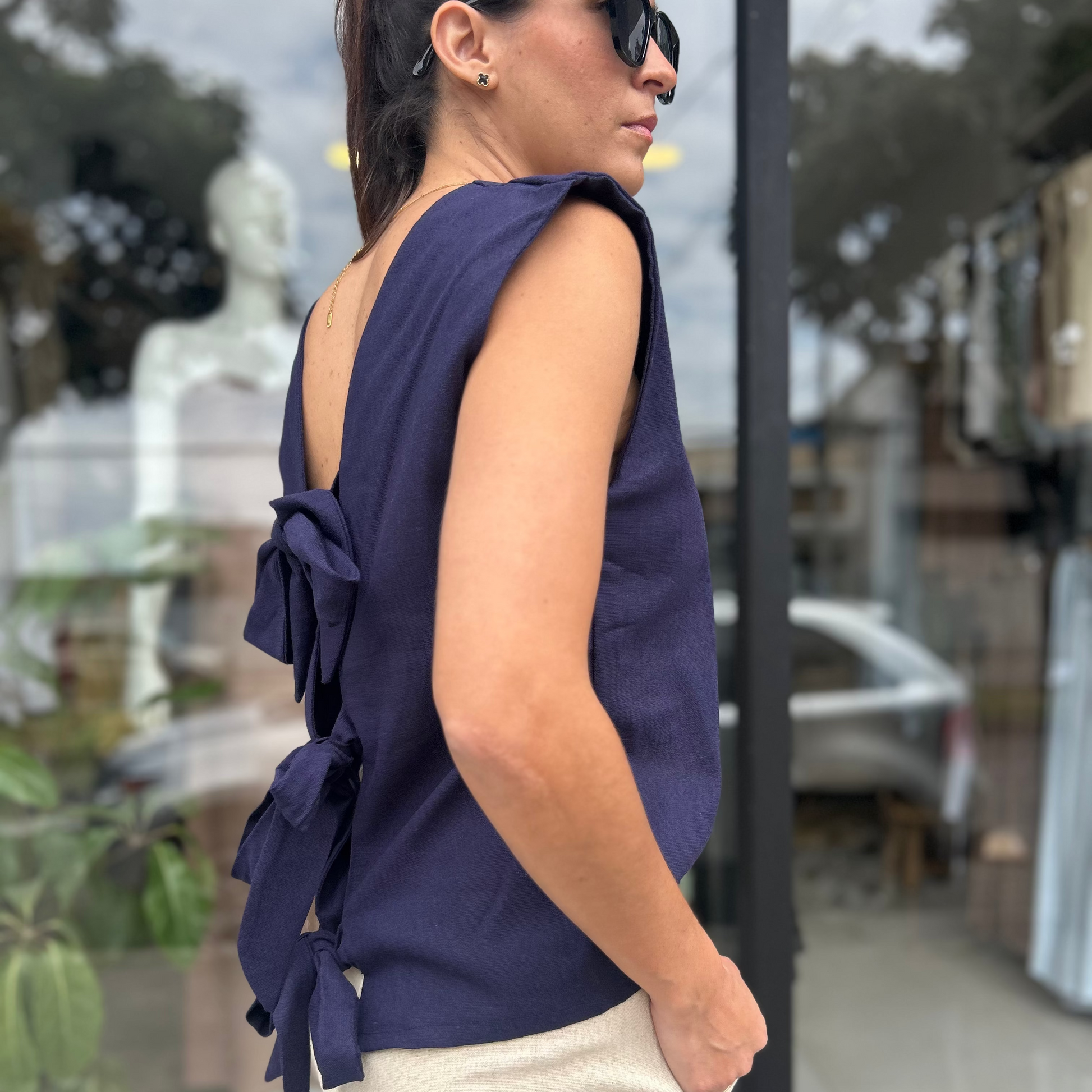 Blusa de tejidos de lino (50% lino + 50% algodón), con lazos en la espalda y cuello recto. Ligera y elegante.