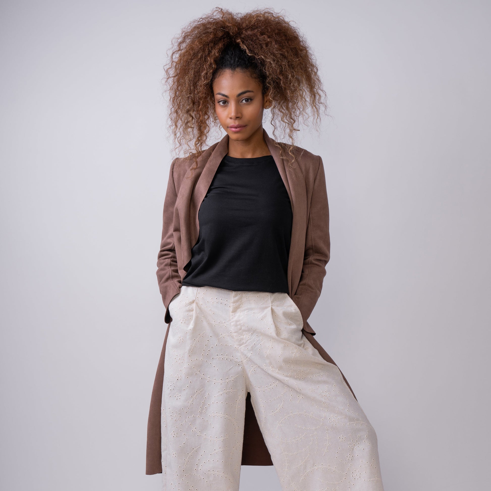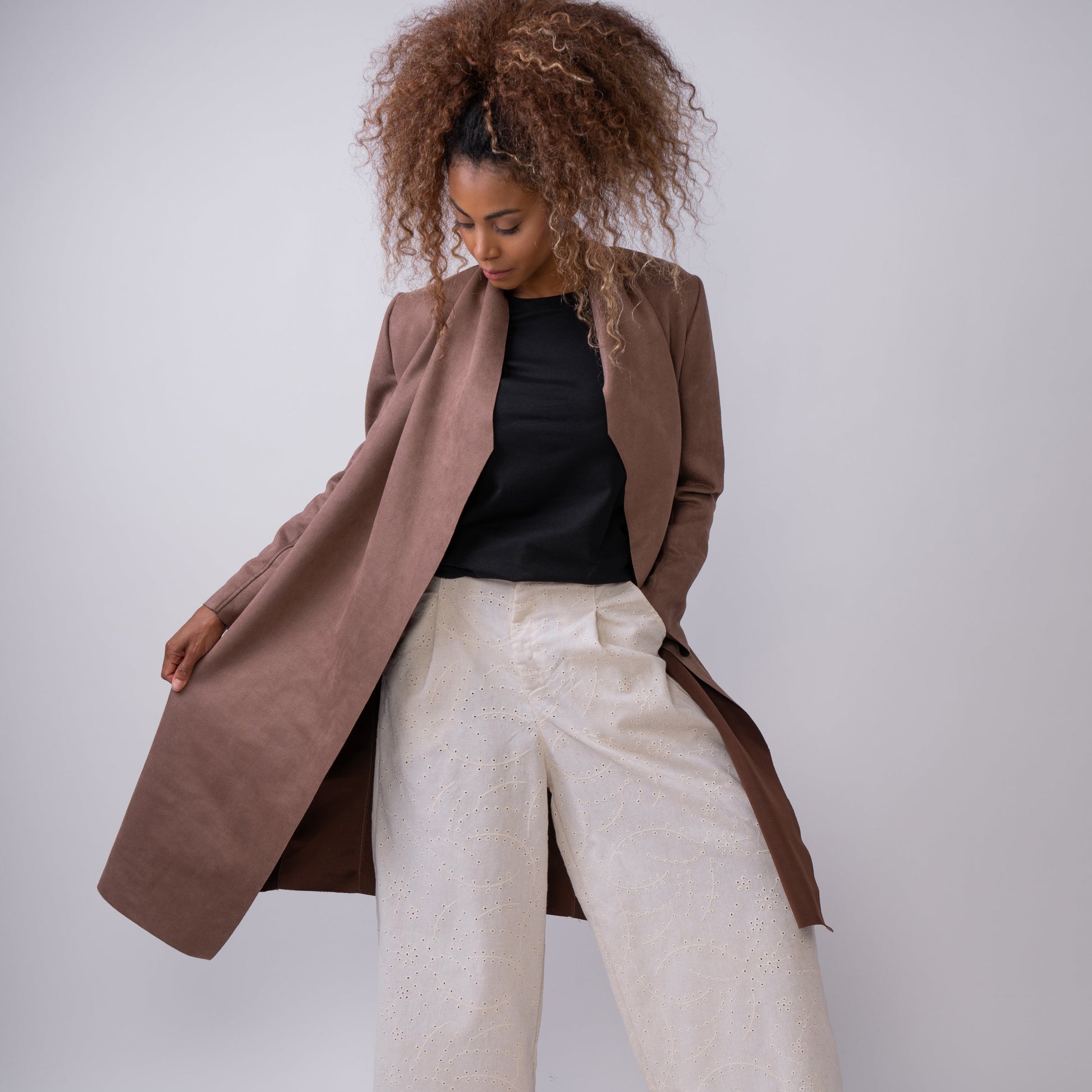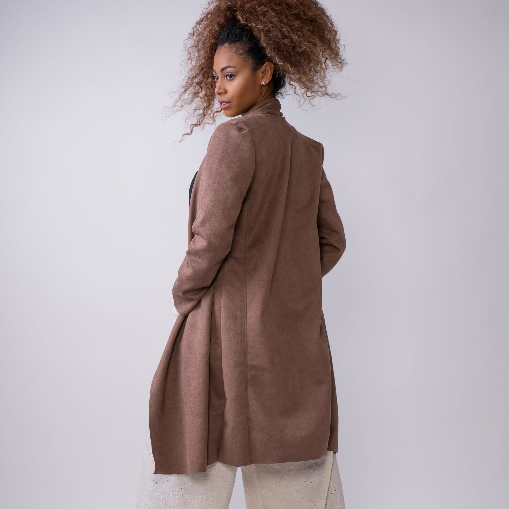De largo elegante y tono café cálido, este abrigo de gamuza destaca por sus cortes en la espalda que realzan la silueta de forma sutil y favorecedora. Su textura suave y su diseño estructurado lo convierten en una prenda sofisticada, natural y con carácter, ideal para complementar cualquier look de temporada.