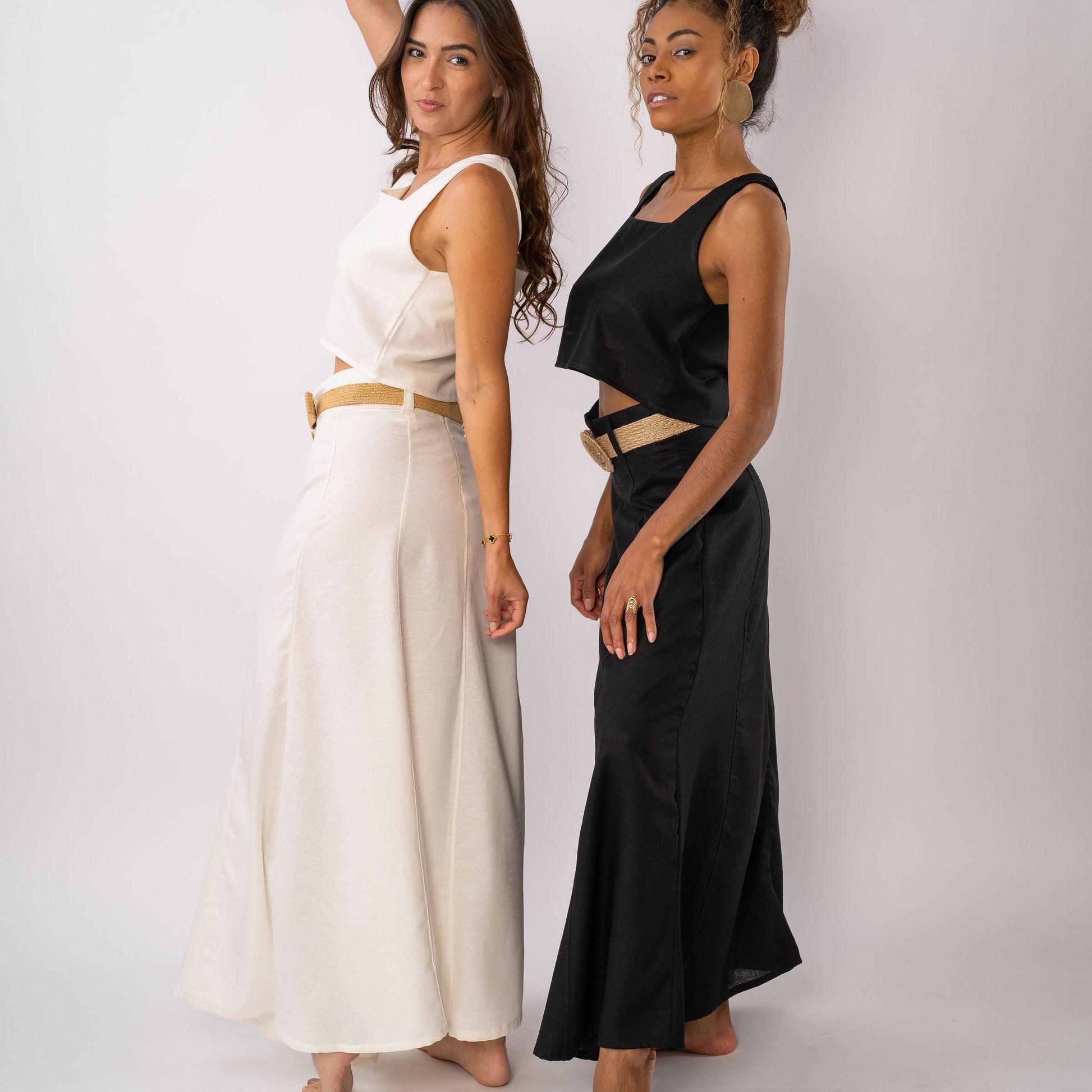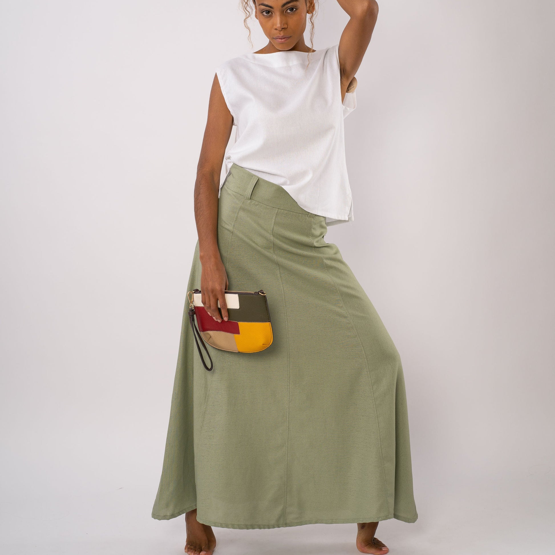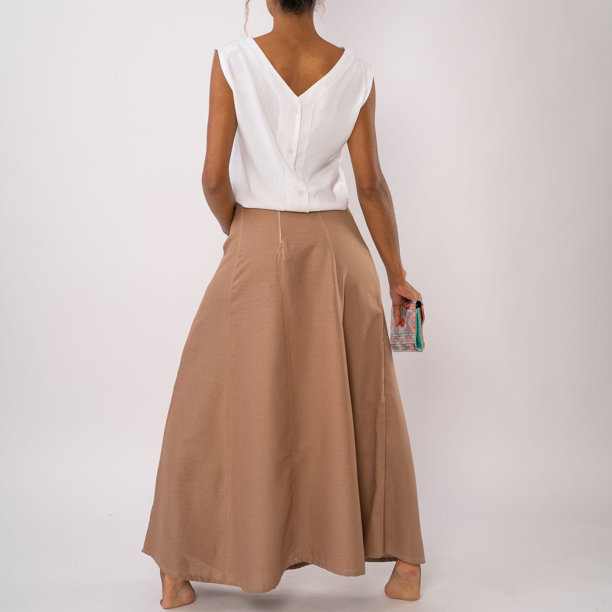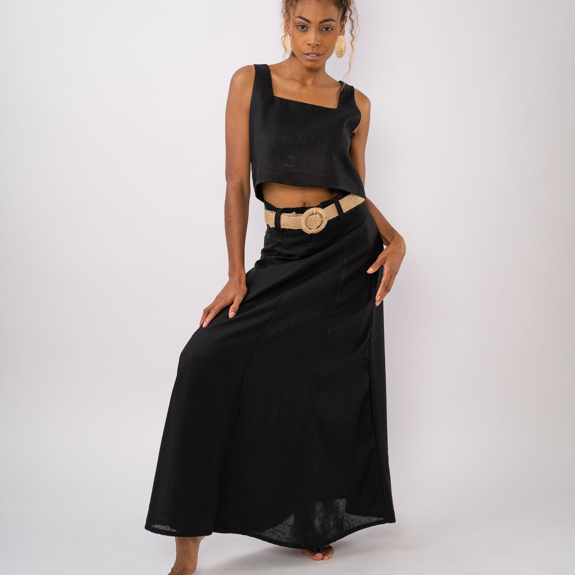 Falda larga confeccionada en lino, con una favorecedora silueta en A y cintura alta. La pletina con pasadores de lino complementa el diseño con un toque natural y sofisticado.