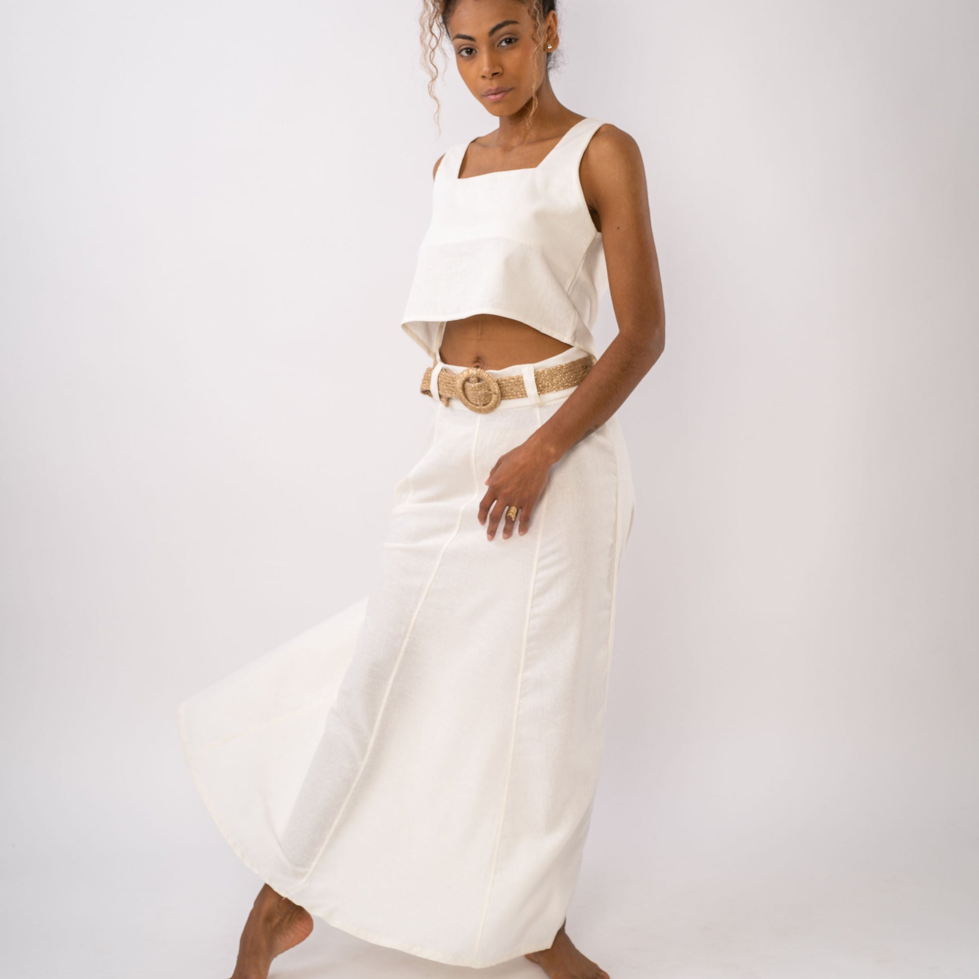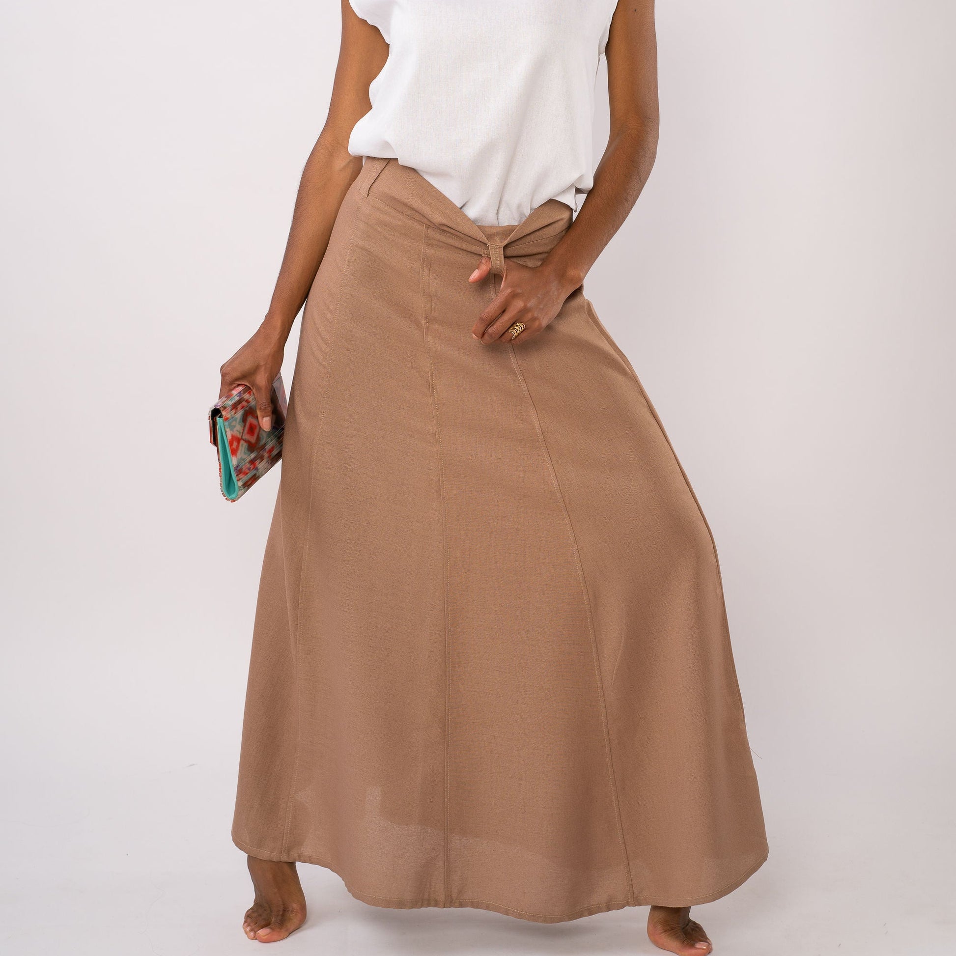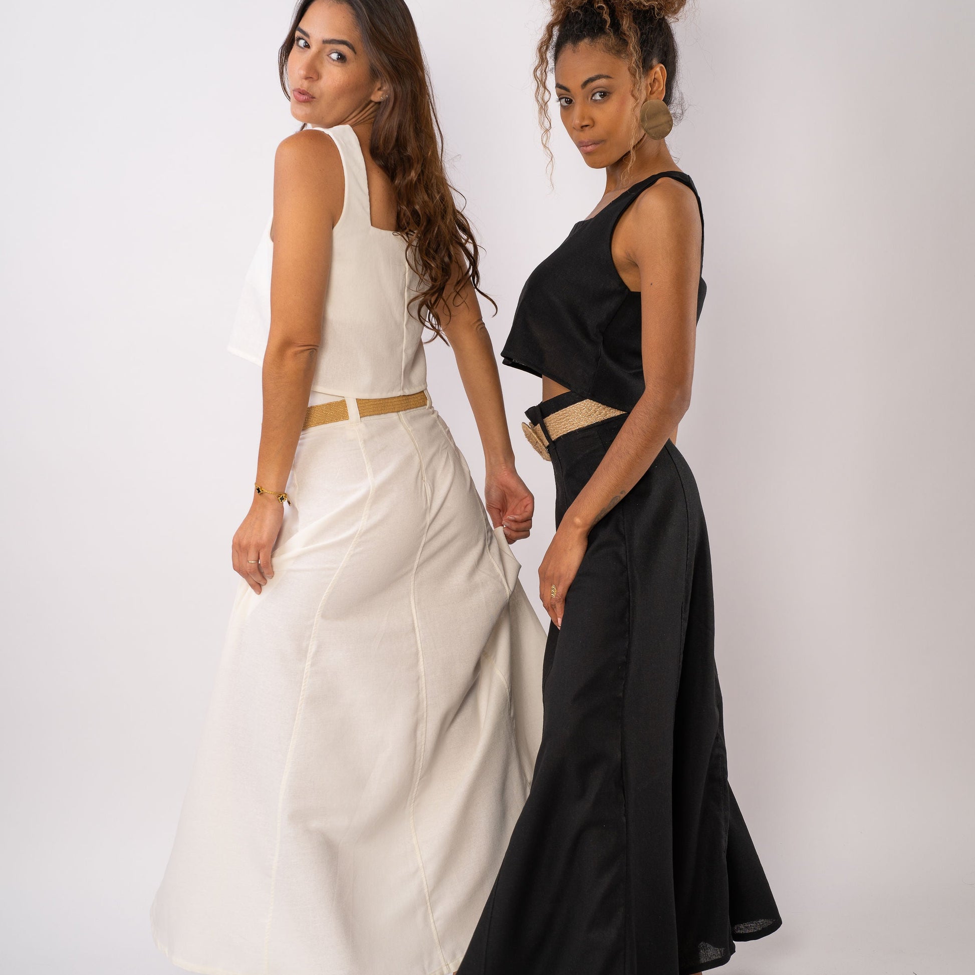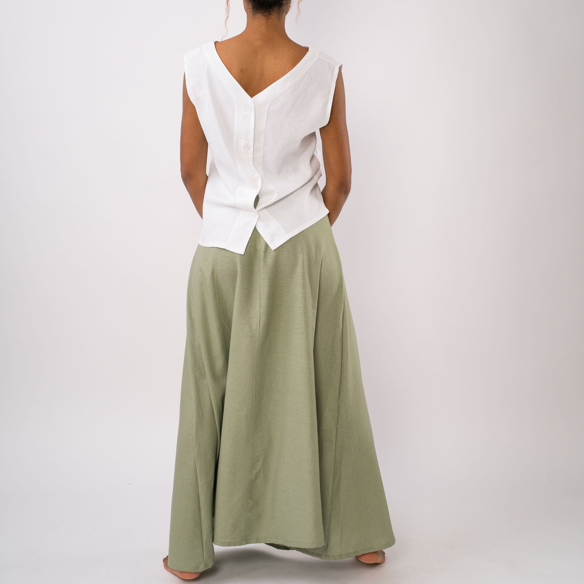 Falda larga confeccionada en lino, con una favorecedora silueta en A y cintura alta. La pletina con pasadores de lino complementa el diseño con un toque natural y sofisticado.