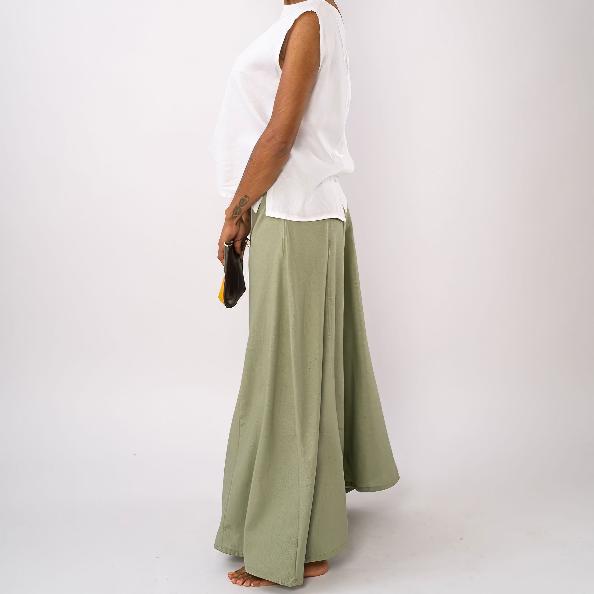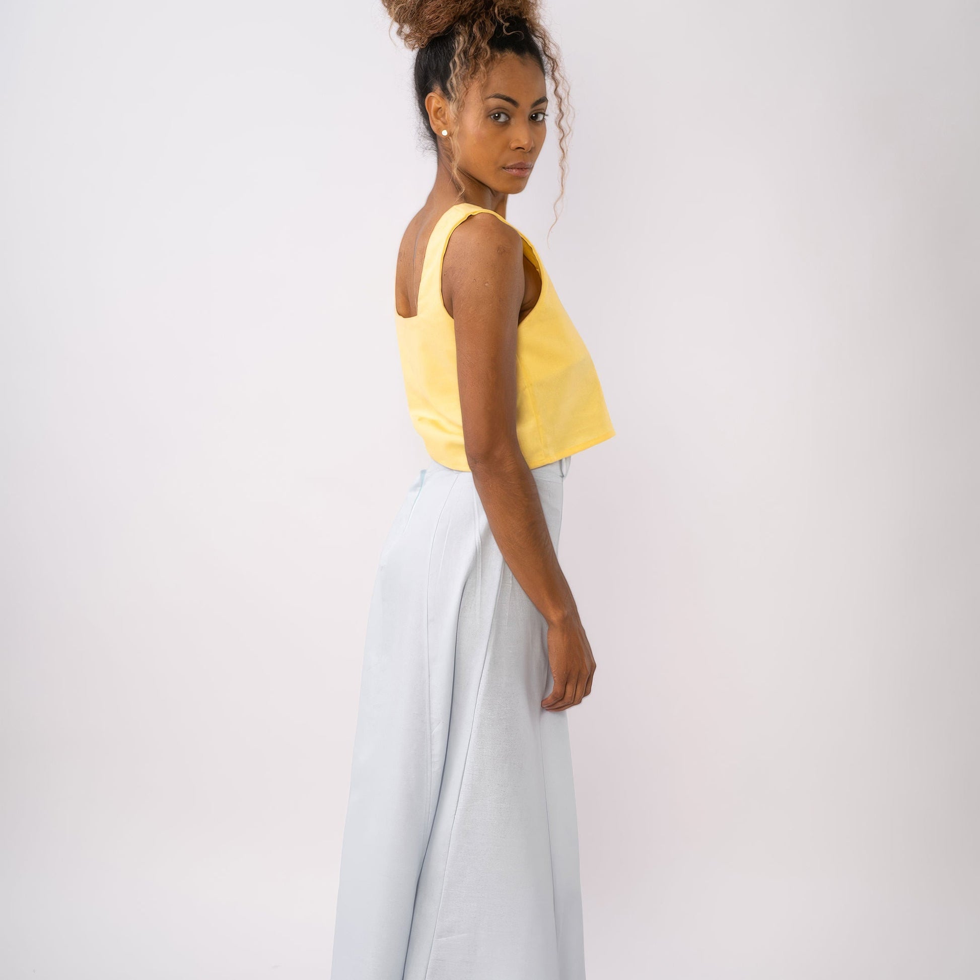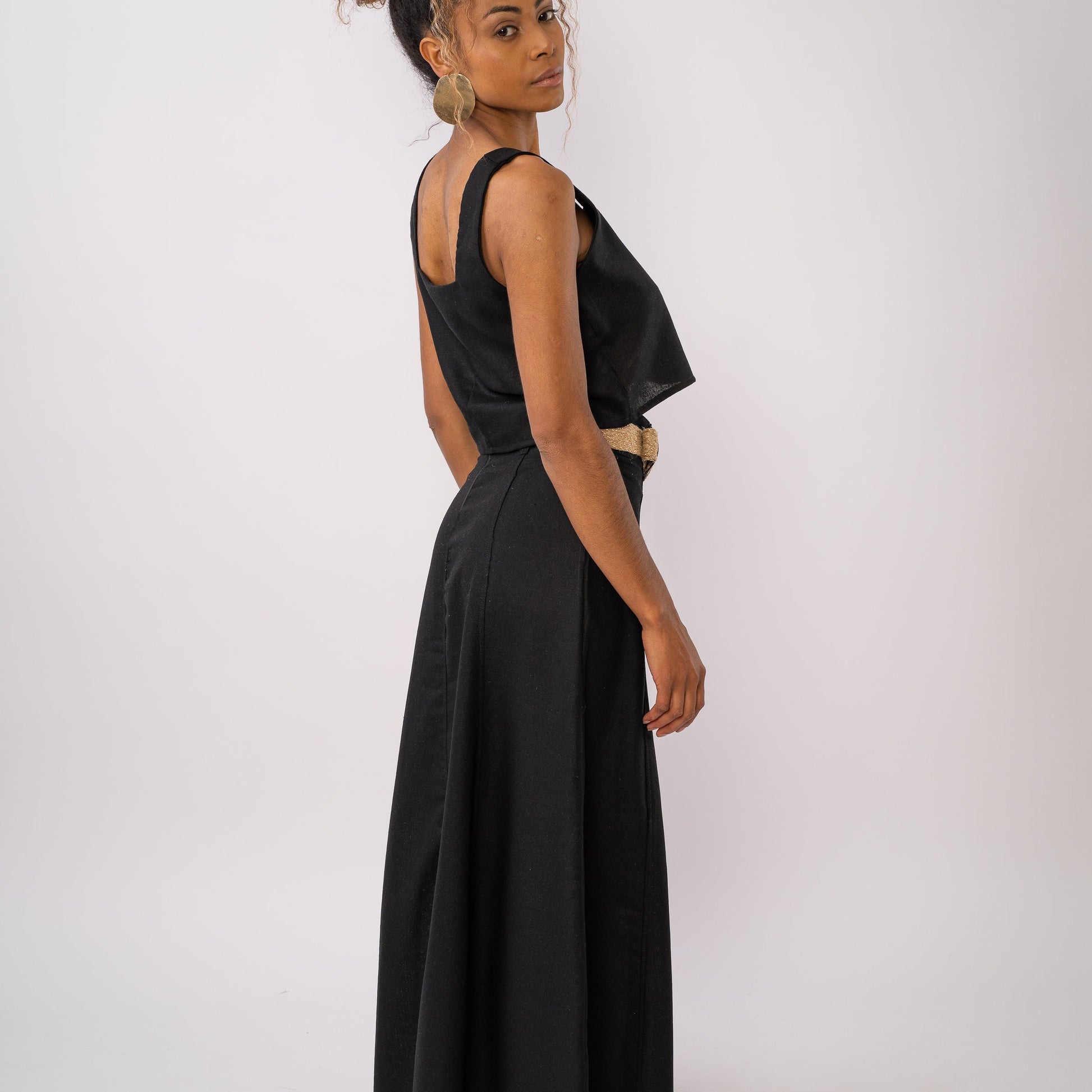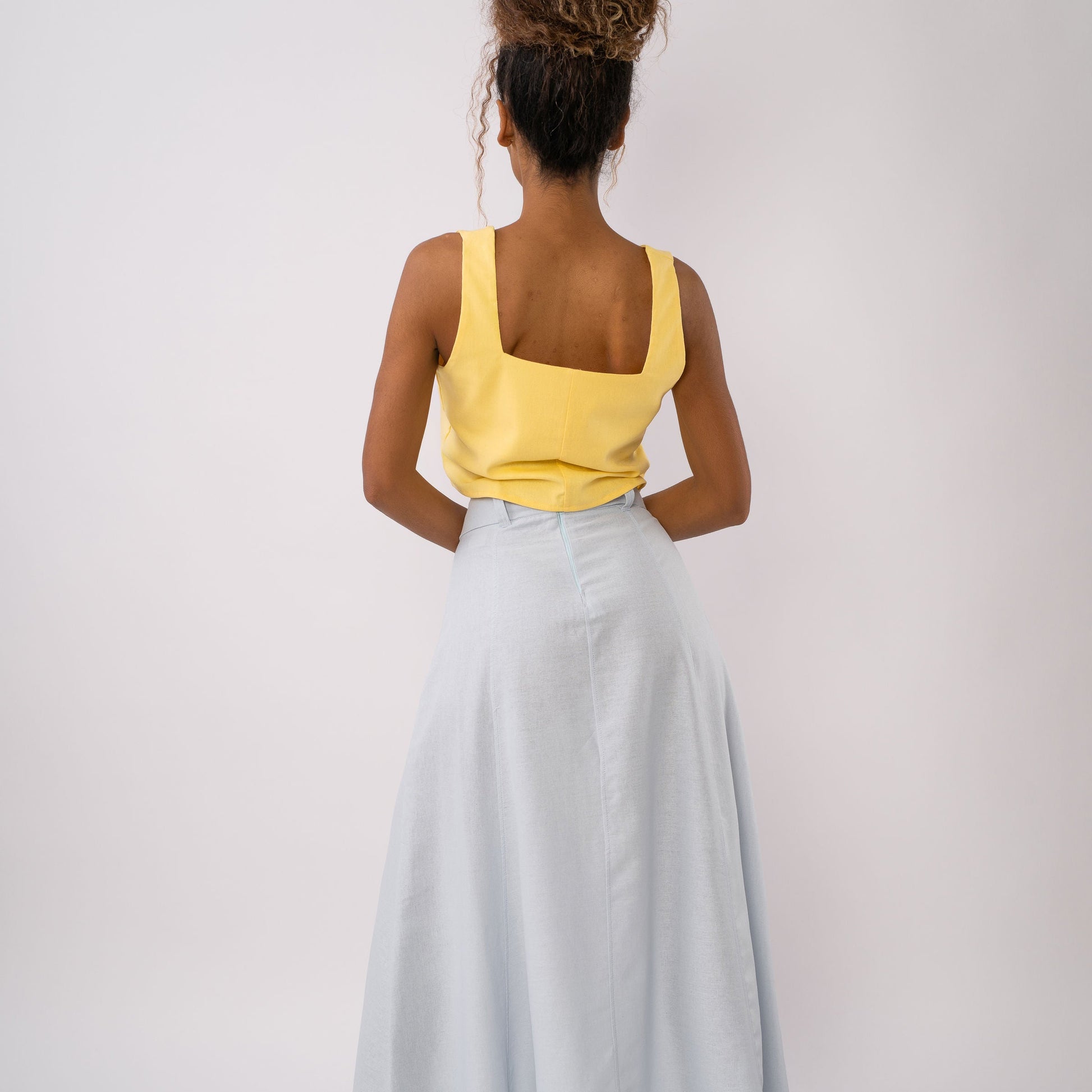 Falda larga confeccionada en lino, con una favorecedora silueta en A y cintura alta. La pletina con pasadores de lino complementa el diseño con un toque natural y sofisticado.