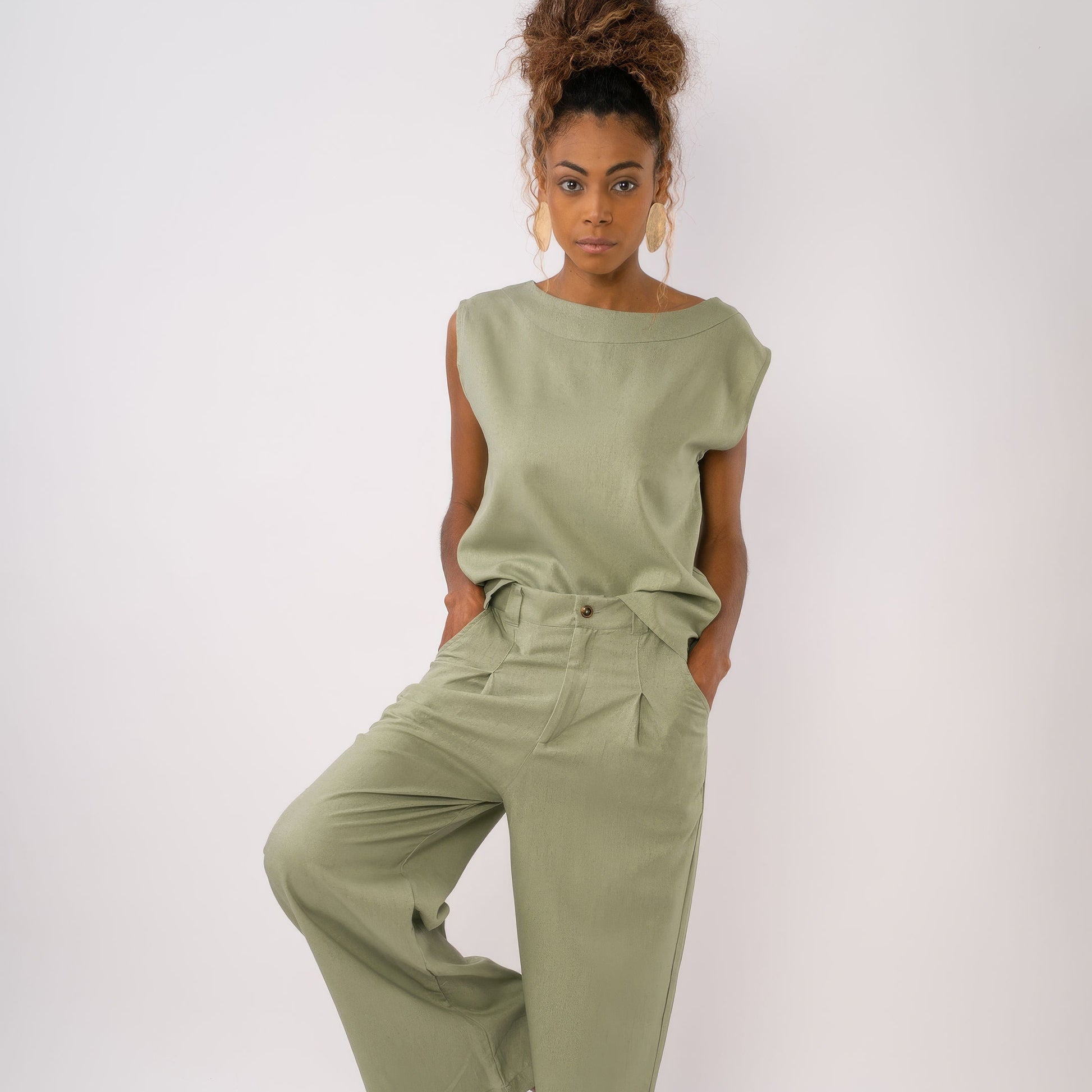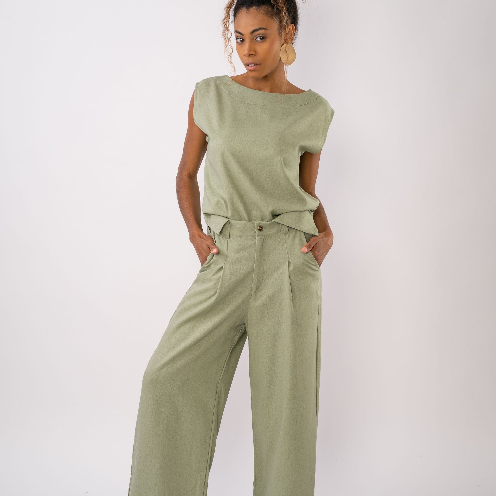 | Con bolsillos, botón forrado, pasador de cinturón y pinzas. | |||