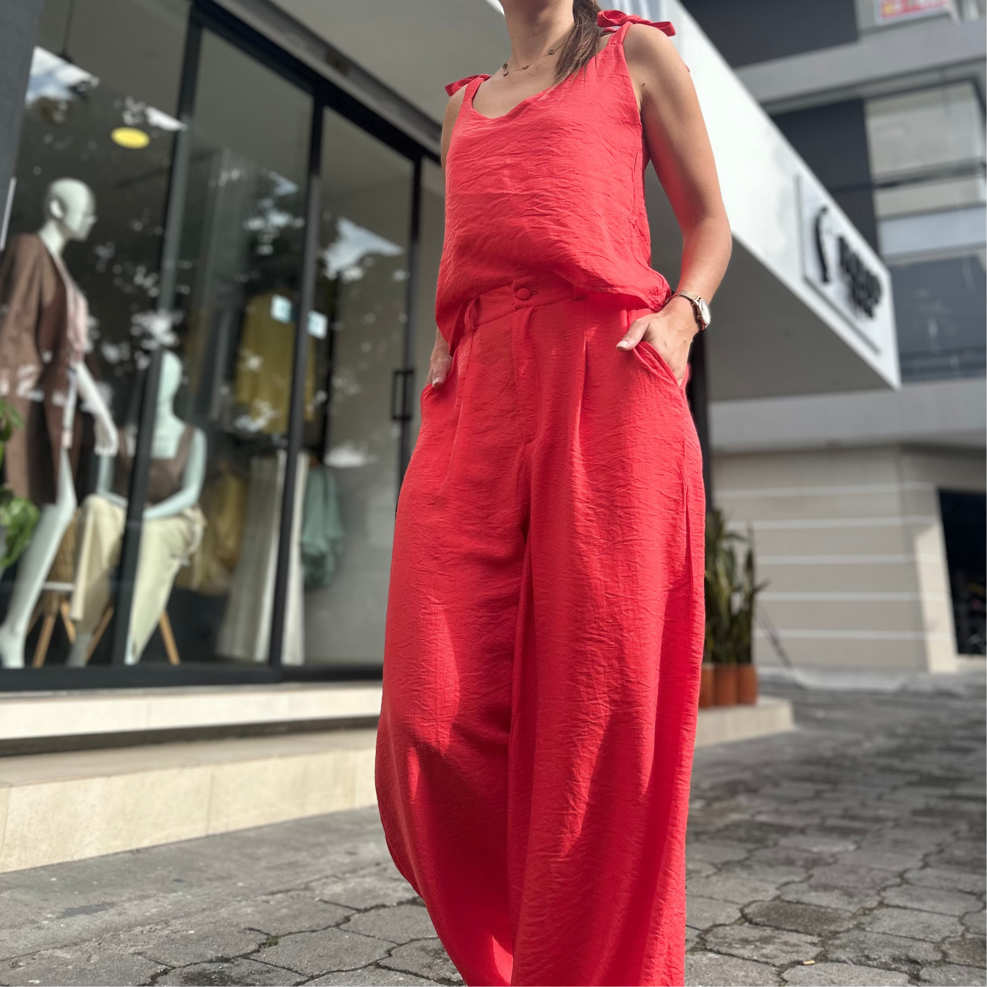 Un conjunto fresco y elegante confeccionado en tela de rayón de origen natural, suave y ligera al tacto. El pantalón cuenta con bolsillos funcionales, pinzas frontales y botón forrado, además de una basta ancha y corte suelto que aporta movimiento y comodidad. La blusa Lola incluye lazos ajustables en los hombros, permitiendo un calce perfecto y un toque femenino ideal para cualquier ocasión.