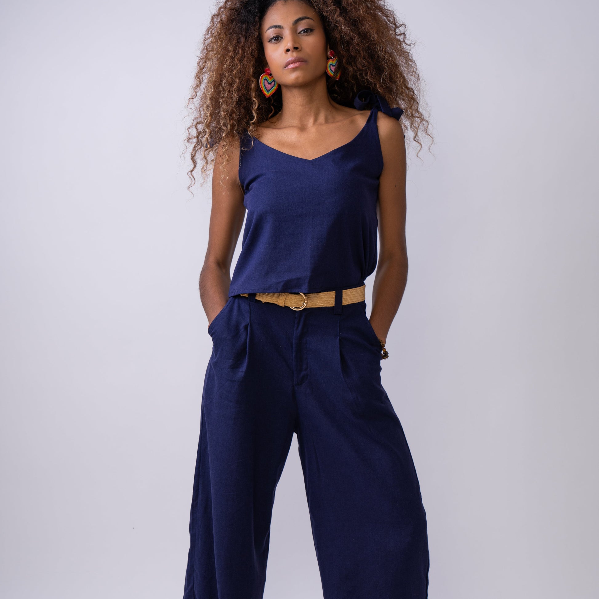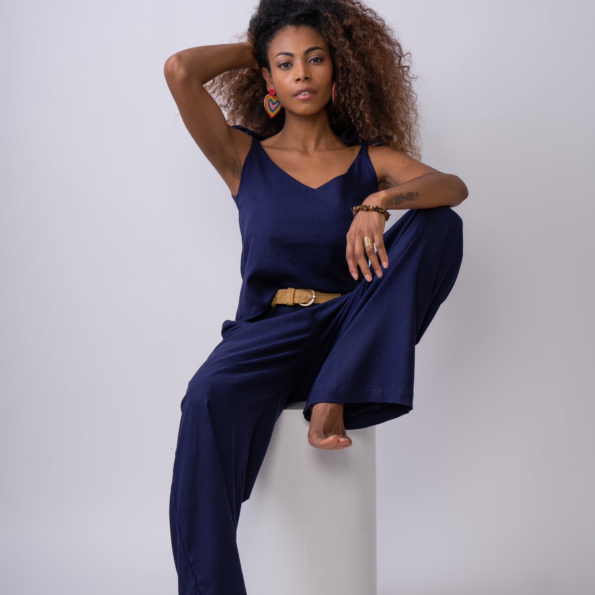 Un conjunto fresco y elegante confeccionado en lino y algodón, suave y ligera al tacto. El pantalón cuenta con bolsillos funcionales, pinzas frontales y botón forrado, además de una basta ancha y corte suelto que aporta movimiento y comodidad. La blusa Lola incluye lazos ajustables en los hombros, permitiendo un calce perfecto y un toque femenino ideal para cualquier ocasión.